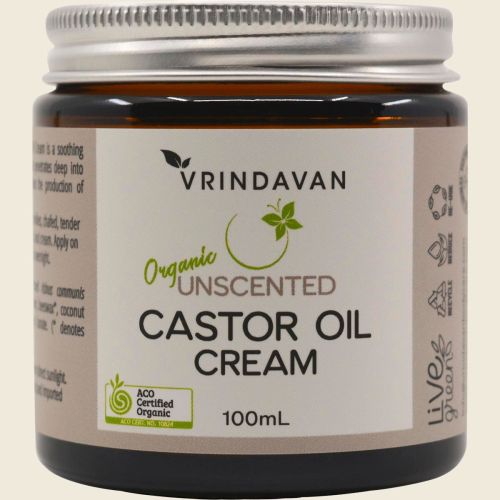 Pure and simple hydration for delicate skin. Vrindavan’s Organic Unscented Castor Oil Cream is made with cold-pressed, hexane-free castor oil, providing intense moisture without any added fragrance or essential oils.