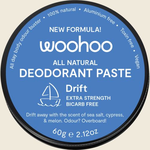 Woohoo Drift is a 100% natural deodorant paste that’s extra-strength, bicarb-free and super gentle on sensitive skin. Delicate notes of sea salt, melon & cypress have got us dreaming of sailboats & clear blue waters. It melts in easily, keeps you smelling fresh all day, and comes in a plastic-free recyclable tin. Suits men, women, and teens.