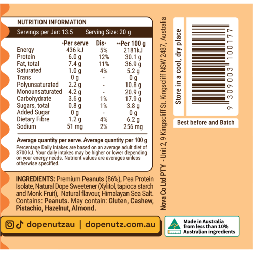 Premium Peanuts (86%), Pea Protein Isolate, Natural Dope Sweetener (Xylitol, Tapioca Starch And Monk Fruit), Natural Flavour, Himalayan Sea Salt.