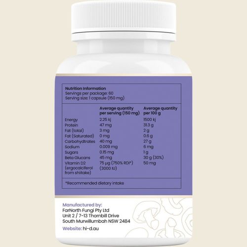 Hi-D is free from gluten, dairy, soy, fish, sugar, extracts, fillers or mycelium