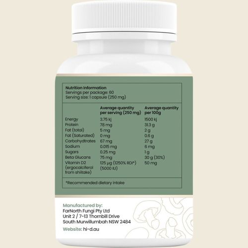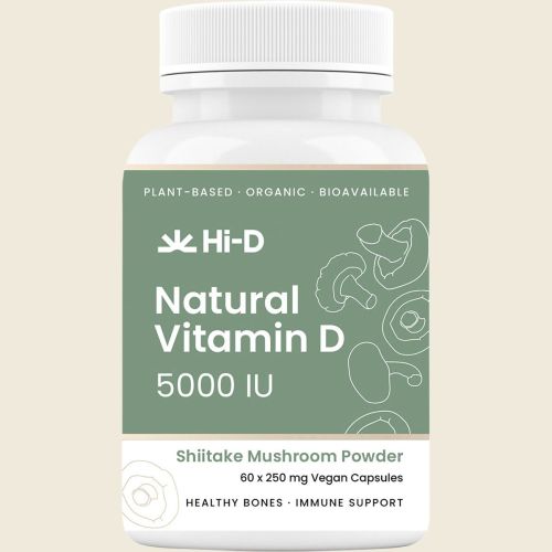 Hi-D Natural Vitamin D 5000 IU - 60 Capsules is a whole food, plant based Mushroom Vitamin D made from Organic Shiitake Mushrooms