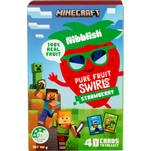 Nibblish x Minecraft Pure Fruit Swirls are here! Join us for the ultimate fruit fuelled quest with our new 100% fruit snacks collaboration. There are 40 Minecraft fact cards to find, so snack smart, and collect them all!