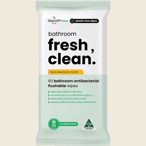 CleanLIFE bathroom fresh, clean. wipes are an antibacterial flushable cleaning wipe designed for bathroom and wet areas that provides an effective clean on benches, tiles, porcelain and stainless surfaces. Simply wipe, clean, disinfect and flush after use - you can also place these into a green bin. bathroom fresh, clean. leaves surfaces with a native fresh smell of Byron Bay lemon myrtle.