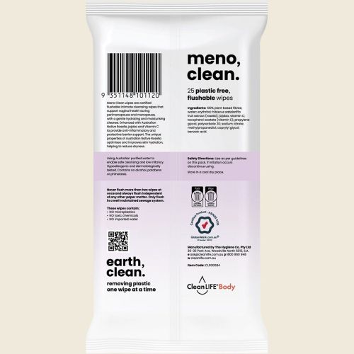 Meno Clean wipes are certified flushable intimate cleansing wipes that support vaginal health during perimenopause and menopause, with a gentle hydrating and moisturising cleanse. Enhanced with Australian Native Rosella, jojoba and Vitamin C to provide anti-inflammatory and protective barrier support. The unique properties of Australian Native Rosella optimises and improves skin hydration, helping to reduce dryness.