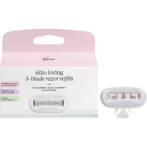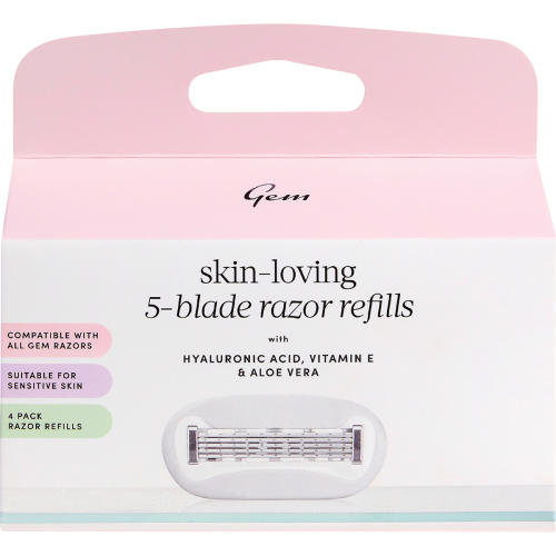 Refresh and reload with our trusty little razor refills.Infused with Hyaluronic Acid, Vitamin E & Aloe Vera to nourish, hydrate, and protect, discover next level silkiness without the irritation. With five sharp blades and a pivoting head for ultimate precision, our bathroom beauty hugs curves and glides like a dream. Compatible with all Gem handles, it’s time to turn a shaving chore into a self care ritual you adore.