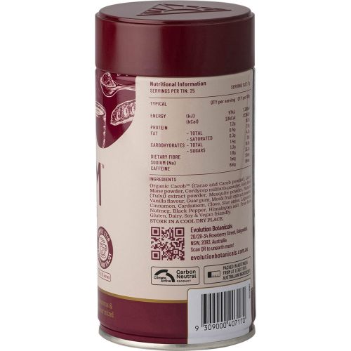 - 175g Evo Karm™ Cacao & Carob powder, in airtight tin. Serving size 7g, servings per tin 25.