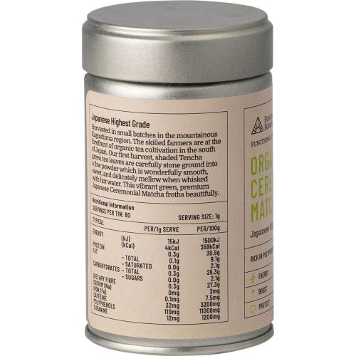 - 80g fine green tea powder, tin with airtight lid. Serving size 1-2g, servings per tin 80.