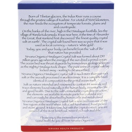 At Nirvana Organics, we have sourced from the Himalayas a totally natural, unrefined, wholesome and holistic crystal salt that is not only great tasting, but is also renowned to contain 84 elements that are essential to life and good health.