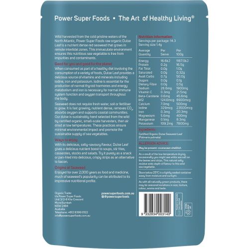 Wild harvested from the cold pristine waters of the North Atlantic, Power Super Foods raw organic Dulse Leaf is a nutrient dense red seaweed that grows in remote intertidal zones. This immaculate environment ensures this nutritious sea vegetable is free from impurities and contaminants.