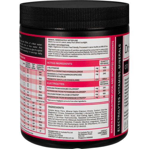 Soluble Maize Fibre, Mineral Salts (Calcium Citrate, Sodium Chloride, Magnesium Citrate, Potassium Chloride), L-Glutamine, Natural Flavour, Acidity Regulator (Citric Acid), Anti-Caking Agent (Silicon Dioxide), Acetyl-L-Carnitine Hydrochloride, Seaweed (Lithothamnion Species), Natural Colours (Carrot, Hibiscus), Sweetener (Sucralose), Minerals (Zinc Gluconate, Sodium Selenite), Probiotic (Bacillus Coagulans), Vitamin B Blend (B3 (Niacin), B5 (Pantothenic Acid), B2 (Riboflavin), B1 (Thiamin Hydrochloride), B9 (Folic Acid), B7 (D-Biotin)