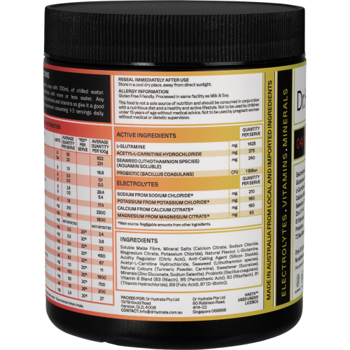 Soluble Maize Fibre, Mineral Salts (Calcium Citrate, Sodium Chloride, Magnesium Citrate, Potassium Chloride), Natural Flavour, L-Glutamine, Acidity Regulator (Citric Acid), Anti-Caking Agent (Silicon Dioxide), Acetyl-L-Carnitine Hydrochloride, Seaweed (Lithothamnion Species), Natural Colours (Turmeric Powder, Carmine), Sweetener (Sucralose), Minerals (Zinc Gluconate, Sodium Selenite), Probiotic (Bacillus Coagulans), Vitamin B Blend (B3 (Niacin), B5 (Pantothenic Acid), B2 (Riboflavin), B1 (Thiamin Hydrochloride), B9 (Folic Acid), B7 (D-Biotin)