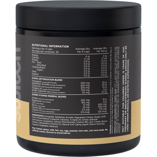 Fenugreek, SpilanthesAcmella, Magnesium Citrate, Shilajit (50% Fulvic Mineral Blend), Cistanche Tubulosa, Tongkat Ali, Smilax Sieboldii (5A-Hydroxy Laxogenin), Calcium Pantothenate (Vitamin B5), Zinc Citrate, Boron Citrate, Colecalciferol (Vitamin D3), Natural Anti-Caking Agent (Silicon Dioxide), Capsule (Vegetable Cellulose)