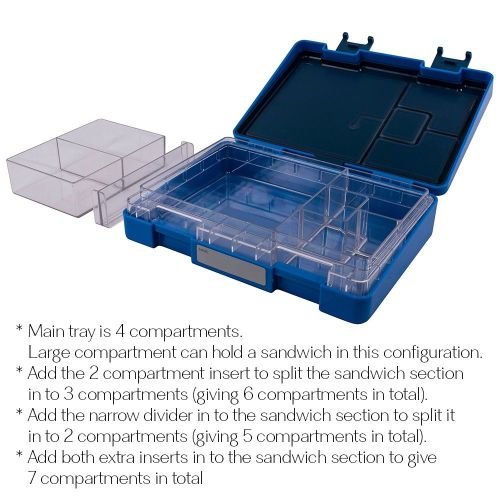 Configurable from 4 to 7 compartments with 2 removable inner pieces. Can hold a sandwich.