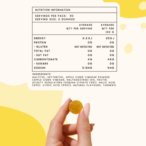 Maltitol, Erythritol, Apple Cider Vinegar Powder (Apple Cider Vinegar, Maltodextrin) 10%, Pectin, Acid Regulators (Sodium Citrate (331), Malic Acid (296), Citric Acid (330)), Natural Flavours, Tumeric