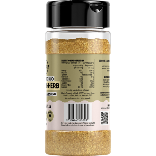 MINGLE'S GARLIC & HERB SEASONING contains garlic and aromatic herbs, a flavour combination made in taste bud heaven. Add this amazing blend to change any meal from bland to grand. Our spice blends have no nasties so shake them on anything, especially great on baked vegetables.