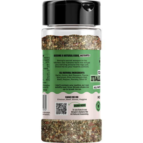 MINGLE'S CIAO BELLA ITALIANO MIX SEASONING is Nonna’s secret weapon in the kitchen. Our Italiano herb mix will get you dancing around the Ragu pot. Shake me to your heart's content. Great on chicken, potatoes, stews, veggies.