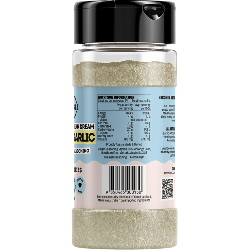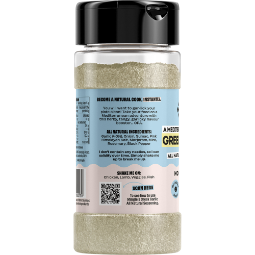 MINGLE'S GREEK GARLIC SEASONING is a tangy garlic-y seasoning that will bring your lamb, salads and potatoes to life! This shaker is super versatile and can bring a bit of the Mediterranean to your cooking. Think mint, garlic, oregano and a secret zesty ingredient… Sumac.