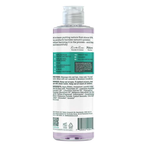 Faith in Nature Lavender & Geranium Shampoo is a balancing formula for normal hair and is best followed by the matching conditioner in the range. Geranium and Lavender are both essential oils known to soothe and balance the scalp. This natural shampoo also contains three organic active naturals known to benefit the hair and scalp - rosemary essential oil, nettle and chamomile.